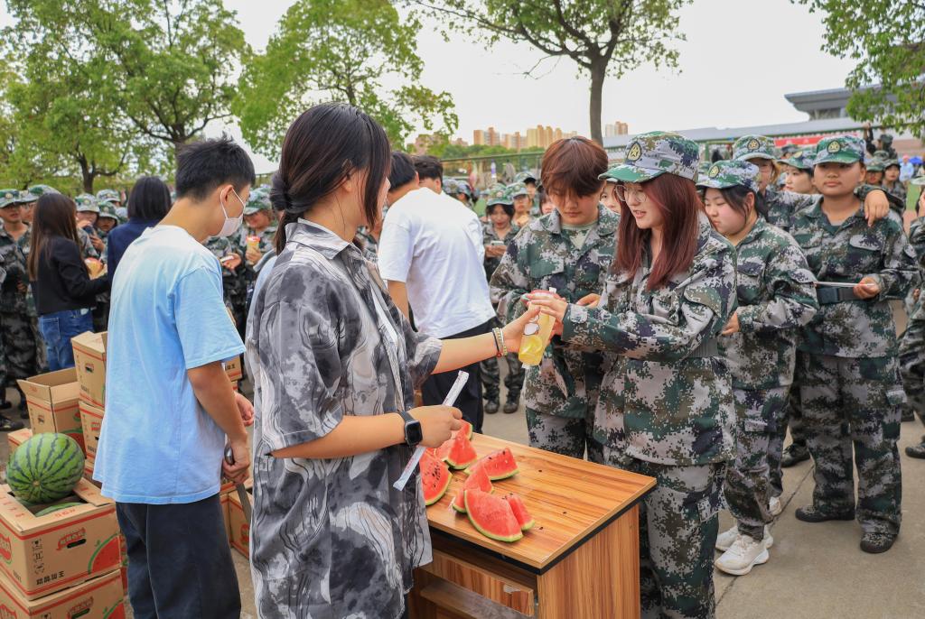 “同学,快来品尝刚刚切好的西瓜!”随着军训解散哨声响起,已经在南田径场门口等候多时的动画专业2021级的汪润向新生们喊到。当看到桌面上已经切好的新鲜西瓜时,“小绿人”们严肃的神情瞬间松弛下来。9月21日下午,伟德国际1949始于英国组织近20名2021级学生代表来到南门操场,给学院正在军训的2022级新生们送来一份“清凉”。