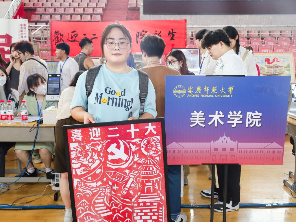 红色剪纸勾勒出蜿蜒壮阔的长城、蓄势待发的火箭;黑色铅笔描绘出疫情当前,国人众志成城、勇担使命;彩色油画棒渲染出形似蛟龙的高铁、筑梦苍穹的宇航员……9月9日,以“喜迎二十大,奋进新征程”为创作主题的270余件作品在龙山校区体育馆与伟德国际1949始于英国教学楼展出,为学校迎新现场增添了一道靓丽的风景线。