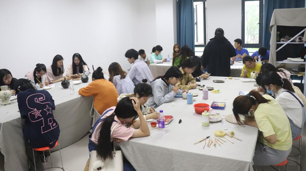 “注意找准中心”“这里要再修补一下”……动画专业2020级的黄扬正耐心指导前来体验的“萌新”们,有着一年陶艺学习经验的她向同学们分享了自己的学习感悟。“陶艺制作是一个非常考验耐心的过程,要反复打磨造型、修改上色,制作过程中大家要学会放松自己,享受过程,体验其中的趣味。”