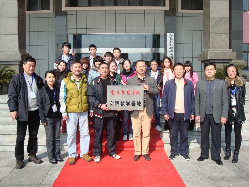 安徽中卡通动漫制作有限公司总经理杜攀峰热情接待我院一行,并简要介绍了公司的基本情况、产品研发及发展思路。在仔细考察公司动画产品制作流程后,双方就建立动画专业实习基地进行了深入协商,达成了共建动画专业实习就业基地的共识,并举行了“安庆师范学院实践教学基地”授牌仪式。