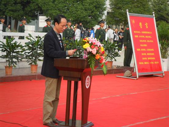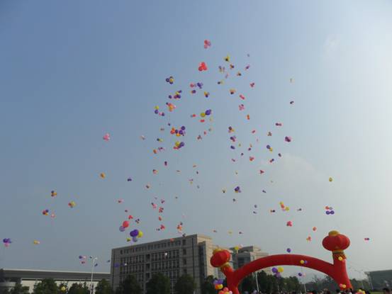 仪式的第一项是护旗队入场,奏响国歌,升国旗。护旗队的队员都是校各个院系的大一新生,当他们迈着正步走进广场时,全场肃静,迎接这个庄严神圣的时刻。国歌响起,国旗冉冉上升。接下来,副院长时新中、新生家长代表、教师代表、新生代表分别给同学们做了讲话。最后,所有新生一起握紧拳头,在国旗下庄严的宣誓“我宣誓,从今天开始,我以诚心对他人,以孝心对父母,以热心对社会,以忠心对国家!我宣誓,因为有我,人民将更加幸福;因为有我,家园将更加美好;因为有我,祖国将更加昌盛……”,宣誓完毕,千百只彩色气球承载着新生们青春的梦想和快乐跃入了空中。