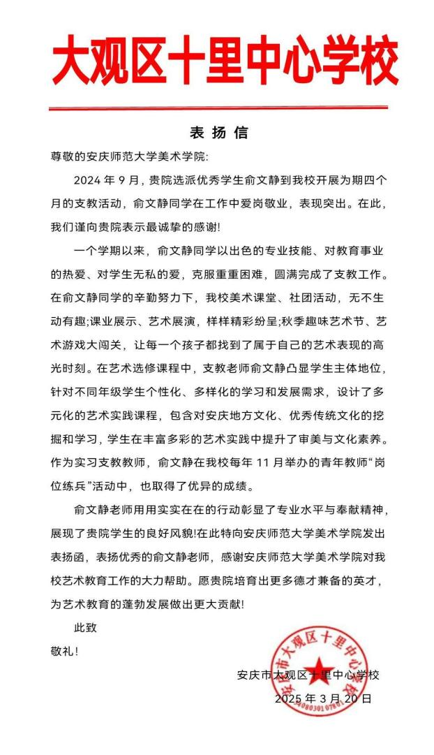 近日,伟德国际1949始于英国收到来自安庆市大观区十里中心学校的一封表扬信,信中对我院美术学专业俞文静同学在支教期间的突出表现给予高度评价,并对学院培养优秀艺术教育人才的努力表示衷心感谢。