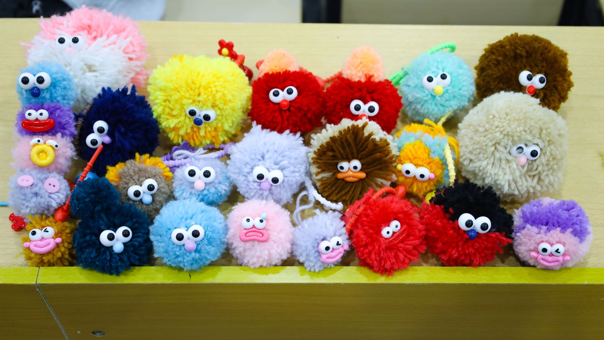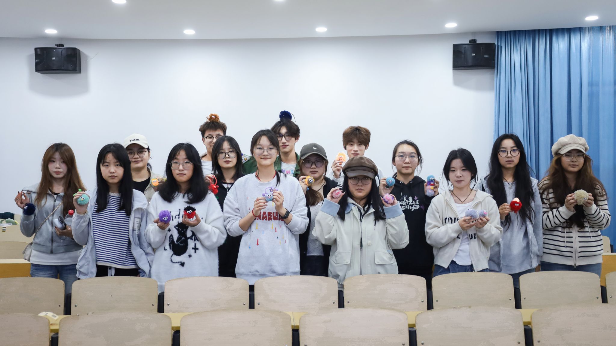 设计学专业2025(1)班的朱梦佳则为自己的作品配上了手环和铃铛,轻轻一晃便发出清脆声响。“修剪毛线球的时候,就像在给它‘整容’,得一点点调整弧度,看着它从参差不齐变得圆润可爱,那种亲手打磨作品的满足感没法形容。”她笑着说,整个过程需要高度专注,不知不觉就沉浸其中,不仅锻炼了耐心,还感受到了慢生活的惬意。