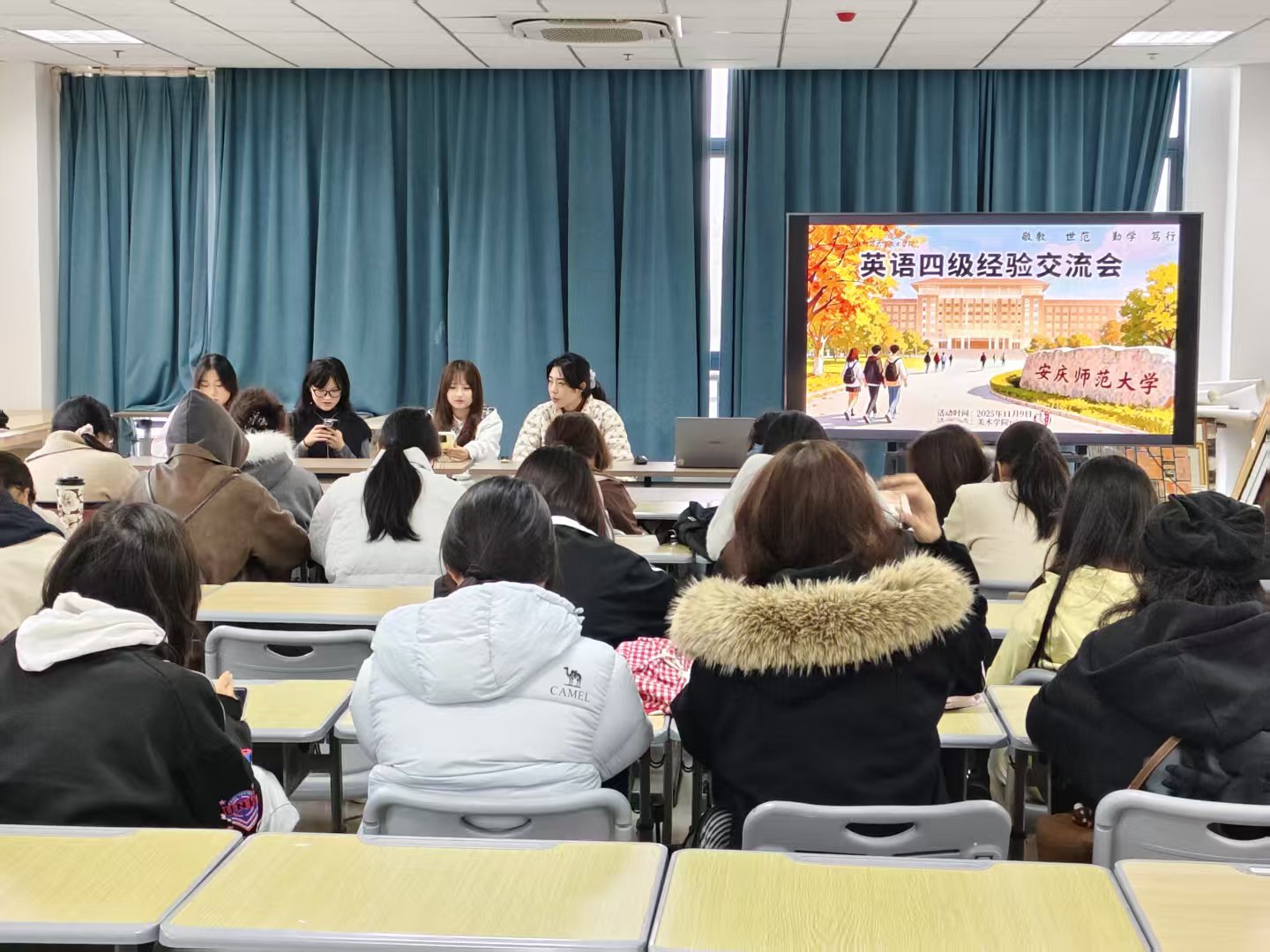 11月9日,伟德国际1949始于英国学生会在新美术楼P210举办英语四级考试经验交流会,活动邀请了伟德国际1949始于英国4名已经通过英语四级考试的同学进行经验交流和分享,2025级新生参加了此次活动。