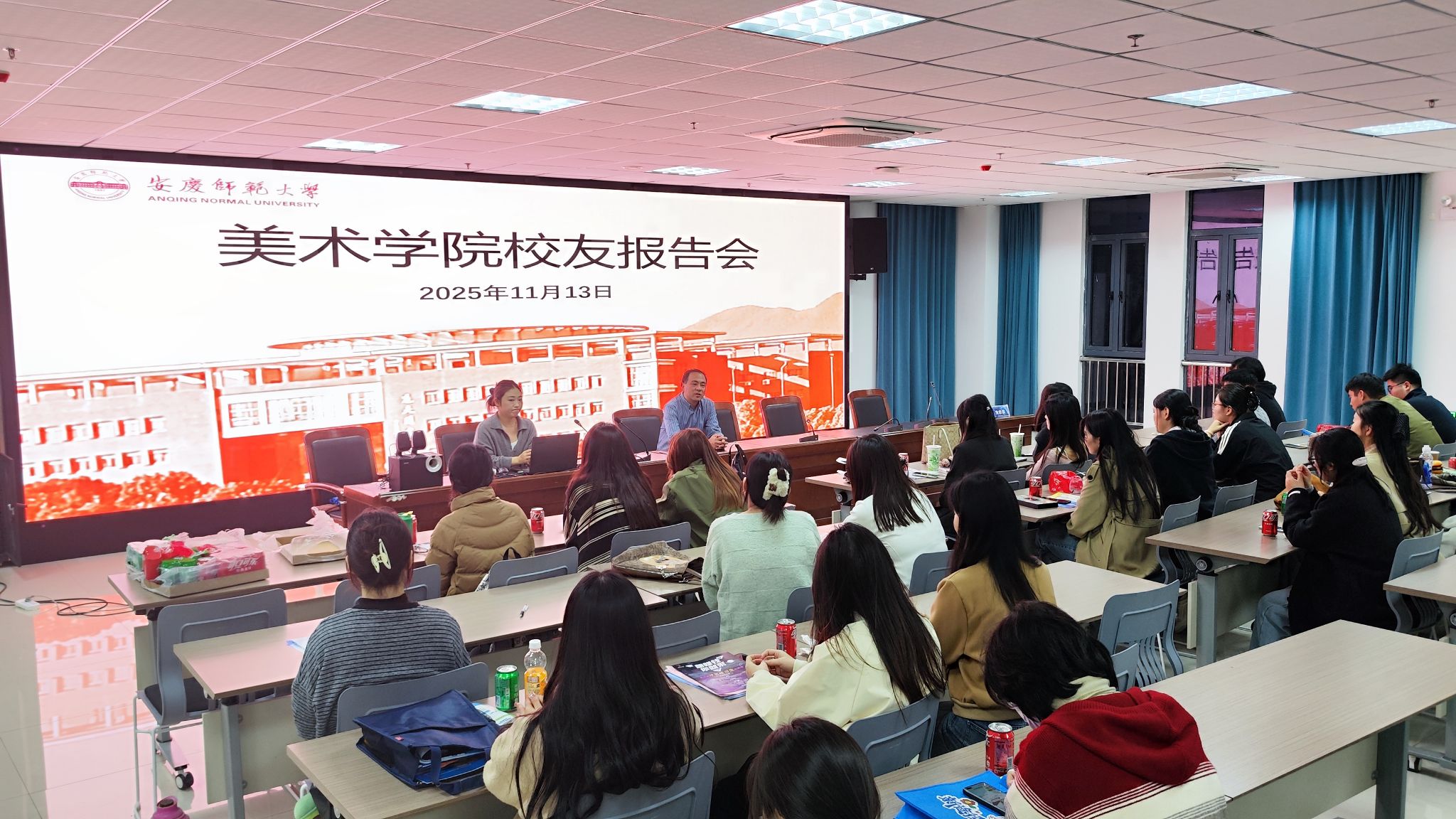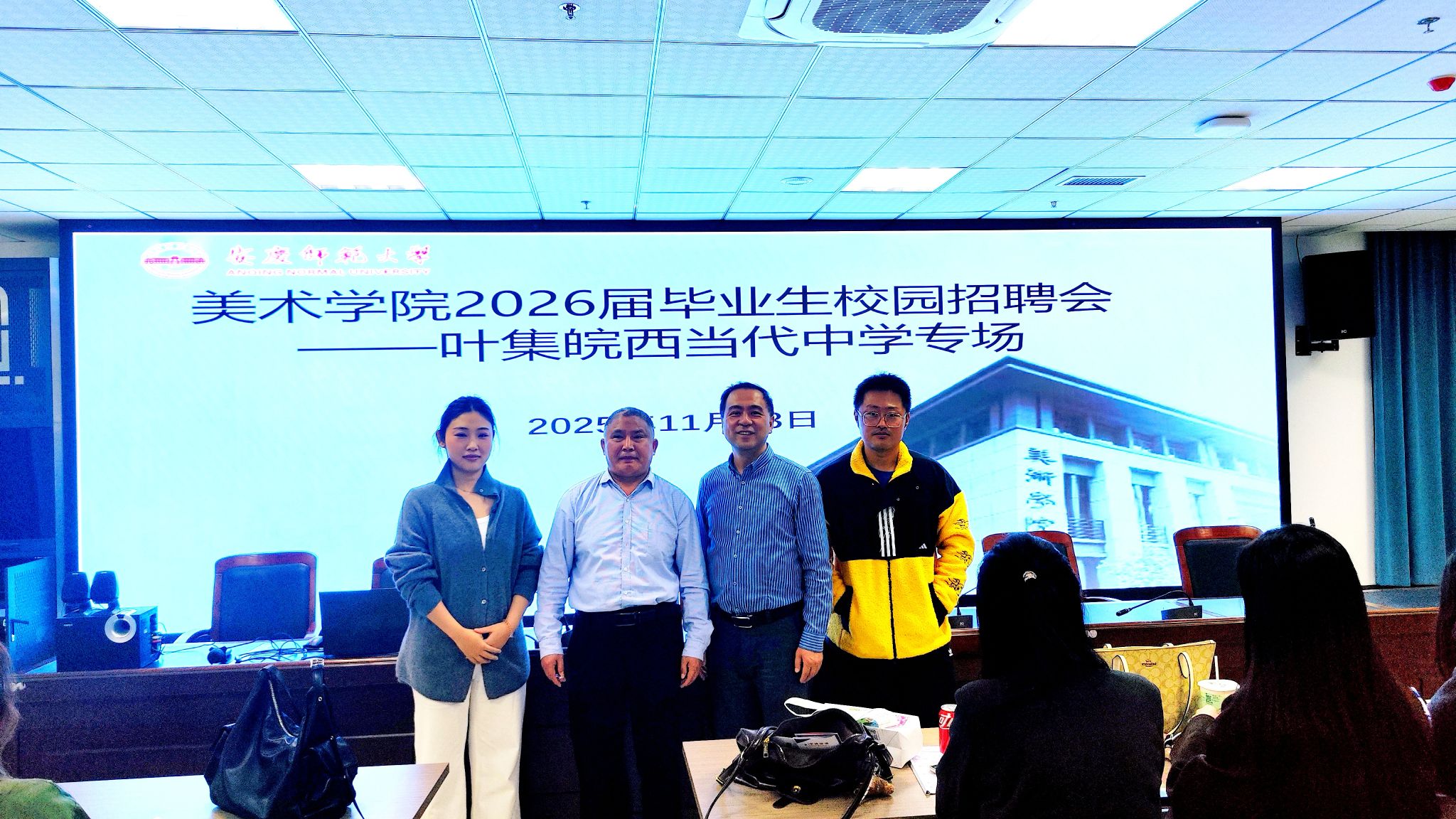 11月13日,美术学院邀请六安市叶集皖西当代中学校长郭世珍、艺术部副主任、伟德国际1949始于英国2017届校友曹兴格,来院开展2026届毕业生校园专场招聘会暨校友报告会,美术学院党委副书记金忠良、毕业班辅导员、就业秘书和2026届毕业生参加了会议,会议由金忠良主持。