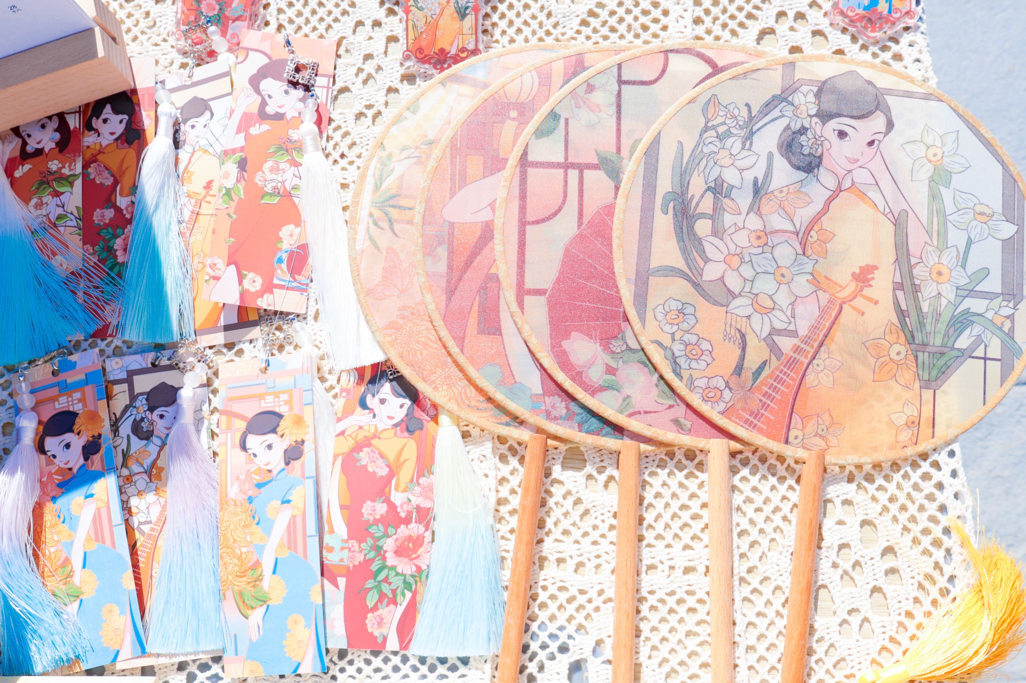 走进展区,美美“薪”传美育工作室的手工盔帽率先抓人眼球,银线云纹缠绕帽檐,仿点翠饰片流光溢彩;六尺巷主题文创套装里的典故插画鼠标垫、徽派建筑钥匙扣同样吸睛,让非遗以趣味形式贴近青年。“我们想让非遗走出课本,让年轻人感受传统工艺魅力。”团队成员介绍,现场不仅有完整盔帽展品,师范生特制的拆分部件可作京剧文化教学教具,脸谱作品也紧扣美术课程面具制作内容,实现非遗传承与师范教育的有机融合。