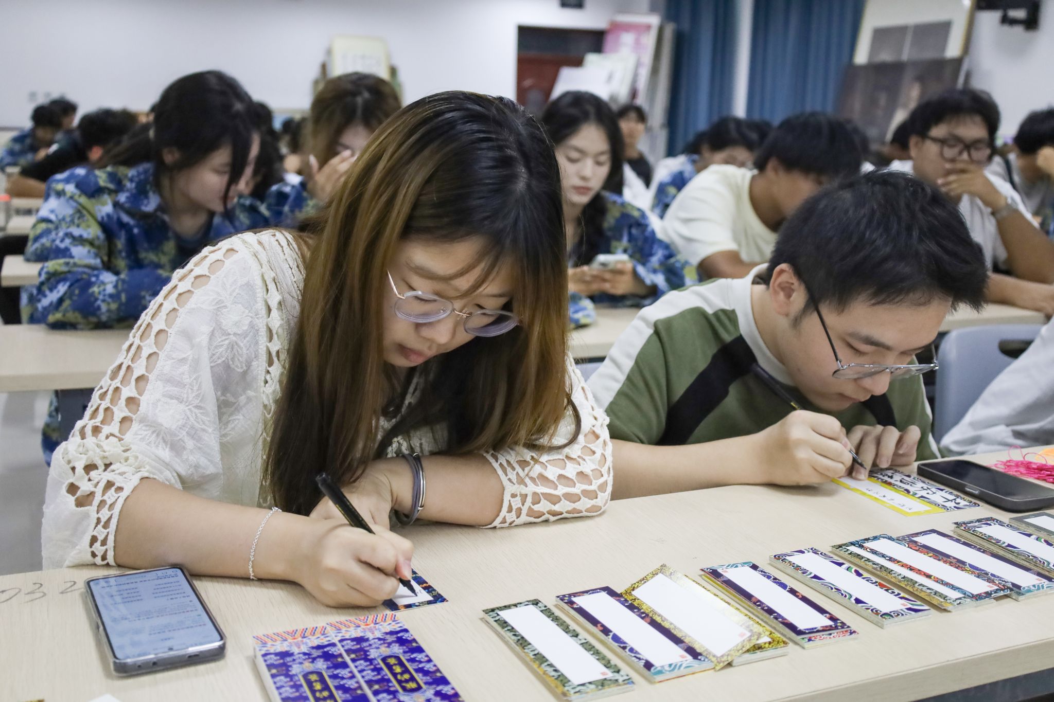 参与同学写下寄语后,将流苏挂穗轻轻穿过书签的小孔,一张张独一无二、满载着情感与期望的书签便在参与学生的手中悄然“诞生”。书签上或是简单的词句,或是深沉的语句,字里行间寄托着学生们对未来美好的期许与祝愿。活动接近尾声,参与学生纷纷拿出手机拍下自己的作品,并摆放在一起拍照“打卡”。