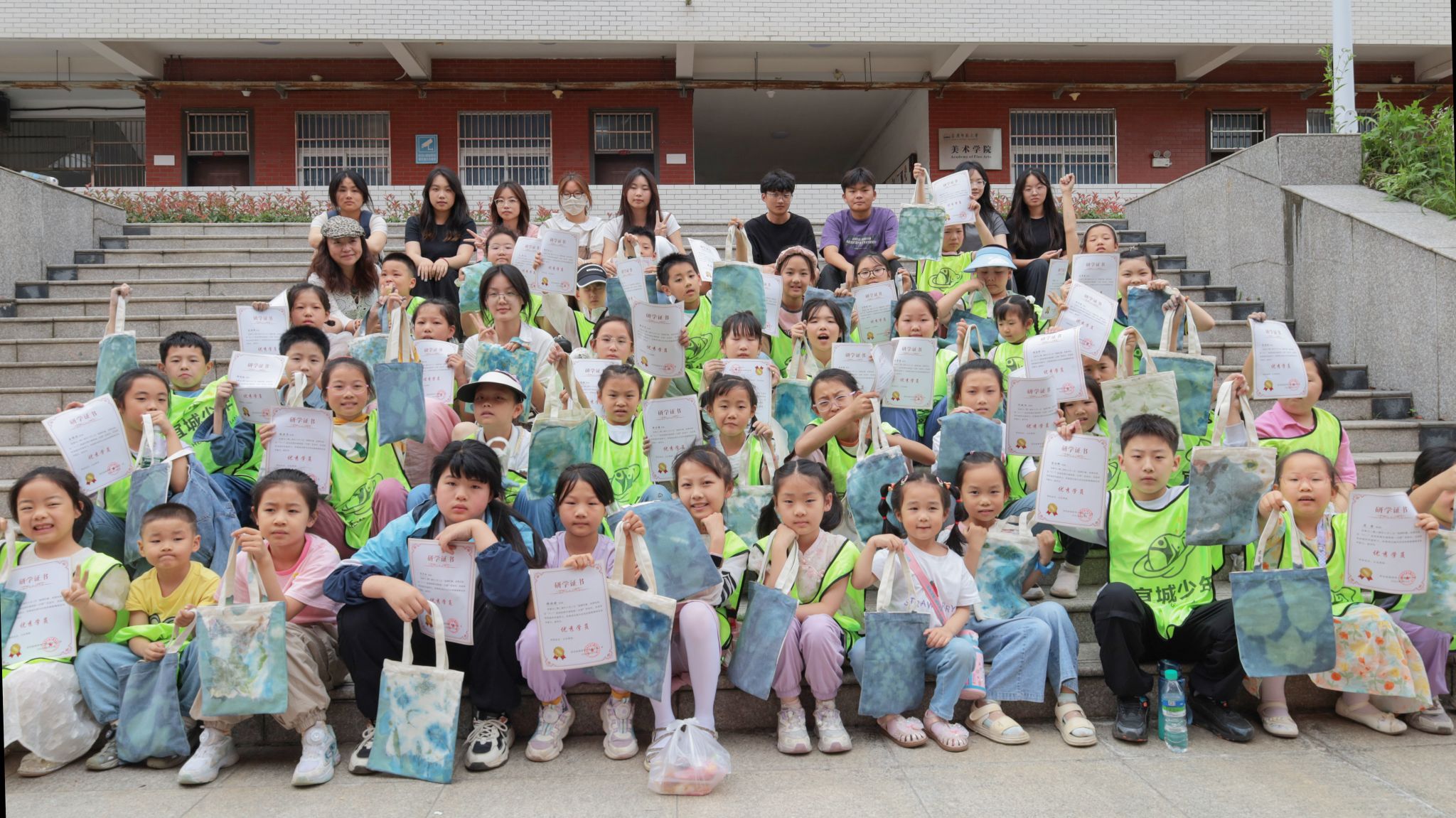 前置步骤处理完成后,志愿者们组织各组成员将帆布包统一放置在学院旁边的草坪上进行晾晒。随着时间的推移,植物的轮廓逐渐在帆布包表面显现,独一无二的影像便被留存在布料上。在晾晒完成后,为给手工帆布包增添更多的色彩,小朋友们跟随志愿者学习拓印技术,将植物的色彩与形状印在帆布包的另一面。
