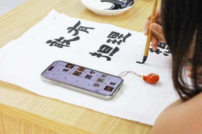 铺开白纸、研墨提笔,与会人员围坐在会议桌前,以书法创作形式深入感悟习近平总书记青年寄语。美术学专业2021(2)班学生党员卞鑫现场临摹邓石如隶书字体,写下了“有理想、敢担当、能吃苦、肯奋斗”十二个字,她收起笔墨时感慨道:“作为新时代大学生,我们应坚定理想信念,将小我融入大我。”
