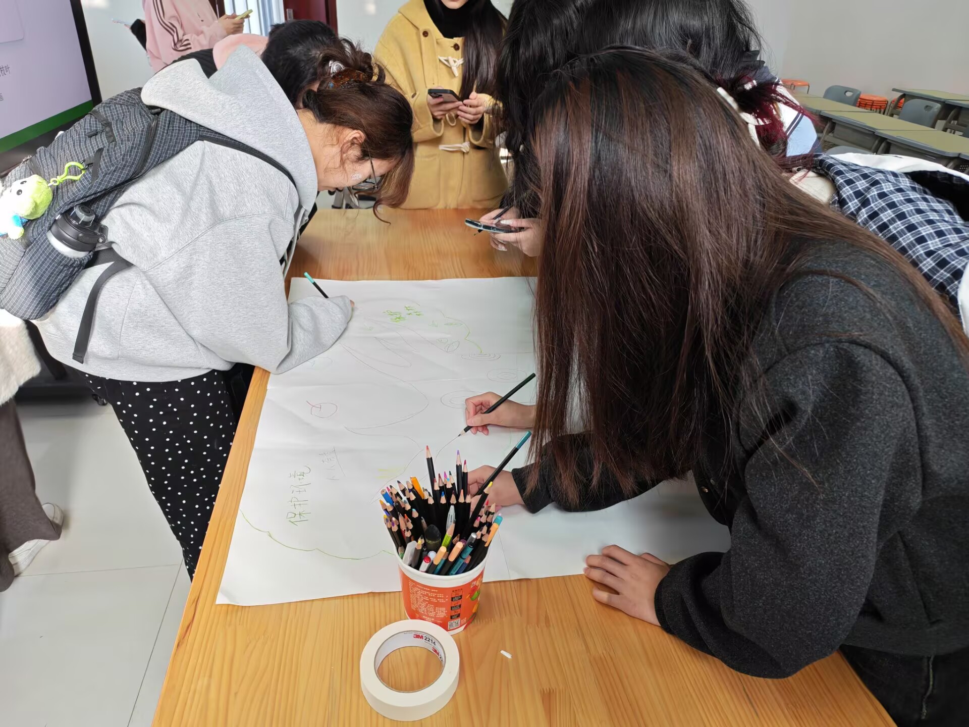 进入核心艺术创作环节,同学们围坐在长幅画布四周,以“巨木林”为核心主题开展集体创意创作。大家手持彩笔、颜料,凝神落笔,用细腻笔触勾勒参天古木的挺拔身姿,用缤纷色彩铺陈森林的生机盎然,将对自然生灵的热爱、对生态文明的期许、对绿色未来的向往,尽数融入每一笔勾勒、每一抹着色。不少同学还在画作周边郑重写下“保护森林,守护家园”“保护环境,人人有责”“共护青绿,不负山河”等暖心寄语,用美院学子独有的艺术语言,传递守护自然生态的坚定决心与青春担当。创作完成后,全体同学纷纷与这幅凝聚集体心血的长卷作品合影打卡,定格这份专属的环保心意,让艺术与生态的共鸣定格留存。