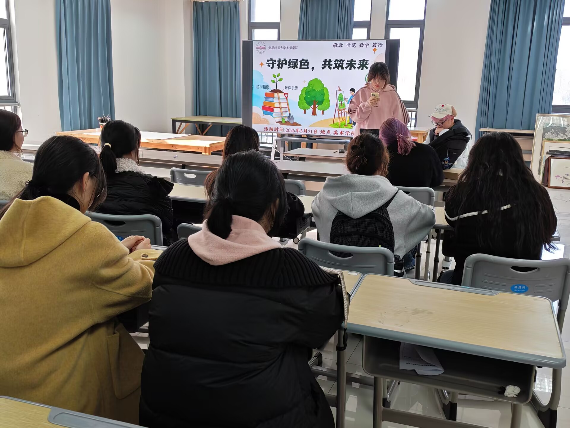 活动伊始,美术学专业2025(2)班李怡迪担任主讲人,结合详实丰富的图文资料与生动鲜活的真实案例,为现场同学细致拆解国际森林日的设立背景、核心宗旨,全面讲解森林在调节全球气候、涵养水土资源、维护生物多样性、筑牢生态屏障等方面的不可替代作用。主讲人还围绕“森林能为我们带来什么”“日常生活中如何践行护林爱林理念”“身边的低碳环保小举措”等话题抛出互动问题,引导同学们主动思考、踊跃举手抢答,现场互动频繁,气氛热烈且秩序井然,彻底打破了生态科普的枯燥感,让专业知识变得通俗易懂、入脑入心。