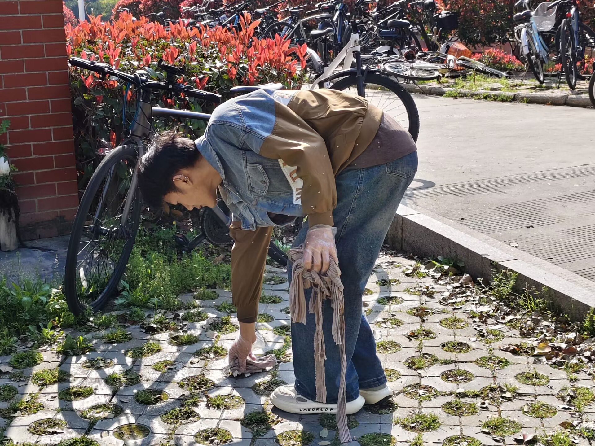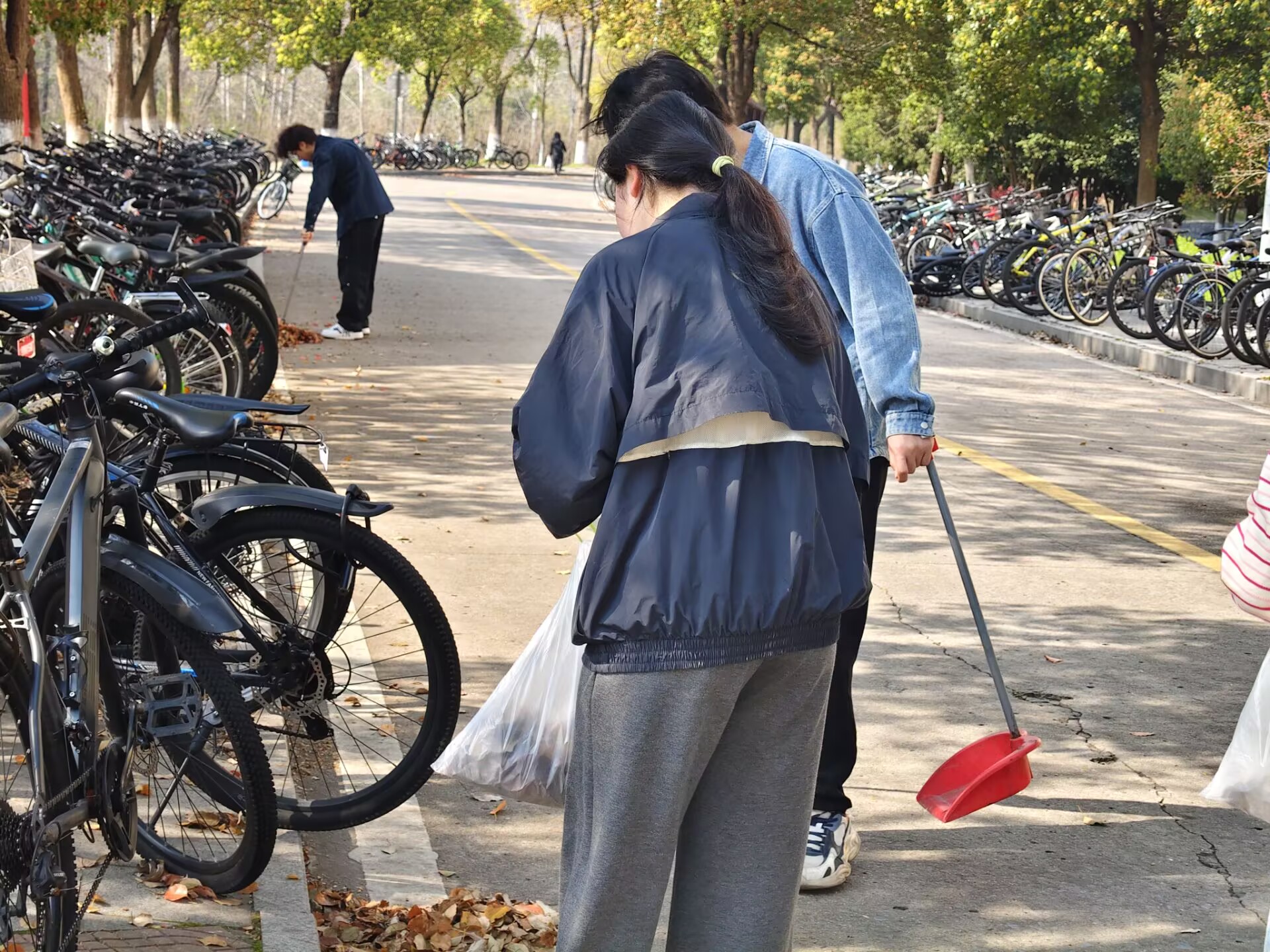 活动现场,志愿者们热情高涨、分工明确,以实际行动投身校园环境整治。大家先后前往美术楼 D 楼周边主干道、沿线绿化带及西苑食堂周边等人员密集区域,进行全面清扫。大家弯腰俯身,细致捡拾白色垃圾与落叶烟头;拿起抹布,悉心擦拭宣传栏与公共设施,对卫生死角进行彻底清理,一砖一瓦皆用心,一草一木尽关情。