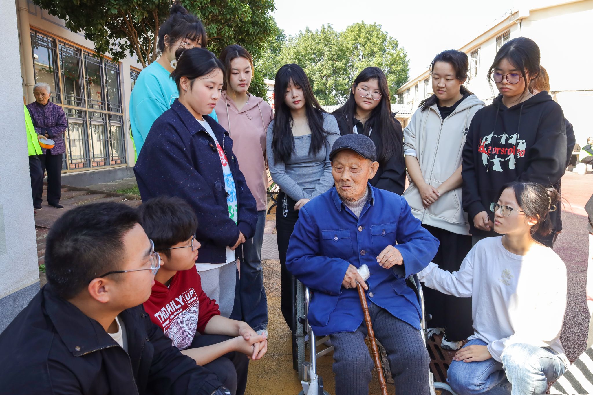 早上不到8点,伟德国际1949始于英国“弘美”志愿队的志愿者们带着拍立得相机、手工永生花和围巾,列队向怡康养老服务中心出发。刚走进院里,许吉言便向学生们招招手,示意他们围坐在自己身边。