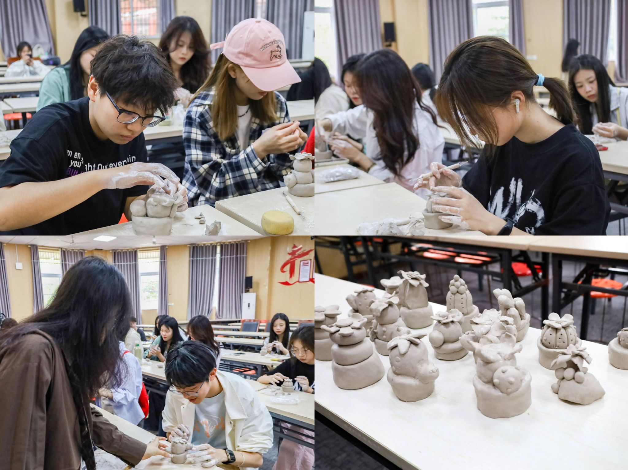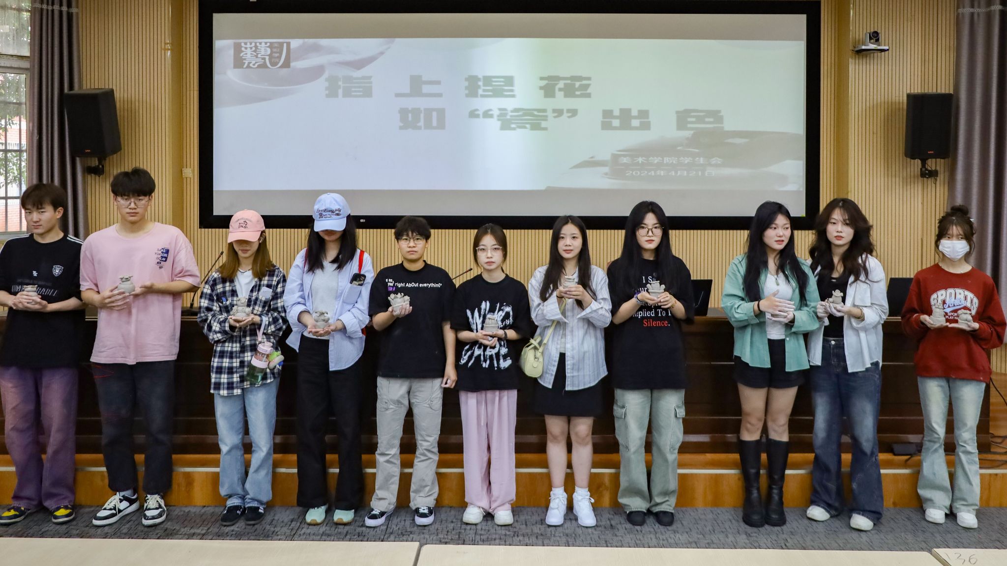 你见过“泥巴”开花吗?平平无奇的陶土在一双双巧手的捏制下“摇身一变”各式各样的盆栽。4月21日,伟德国际1949始于英国开展“指上捏花,如‘瓷’出色”活动,70余名学生齐聚学院学术报告厅,在创作中体验陶土与创意的融合碰撞。