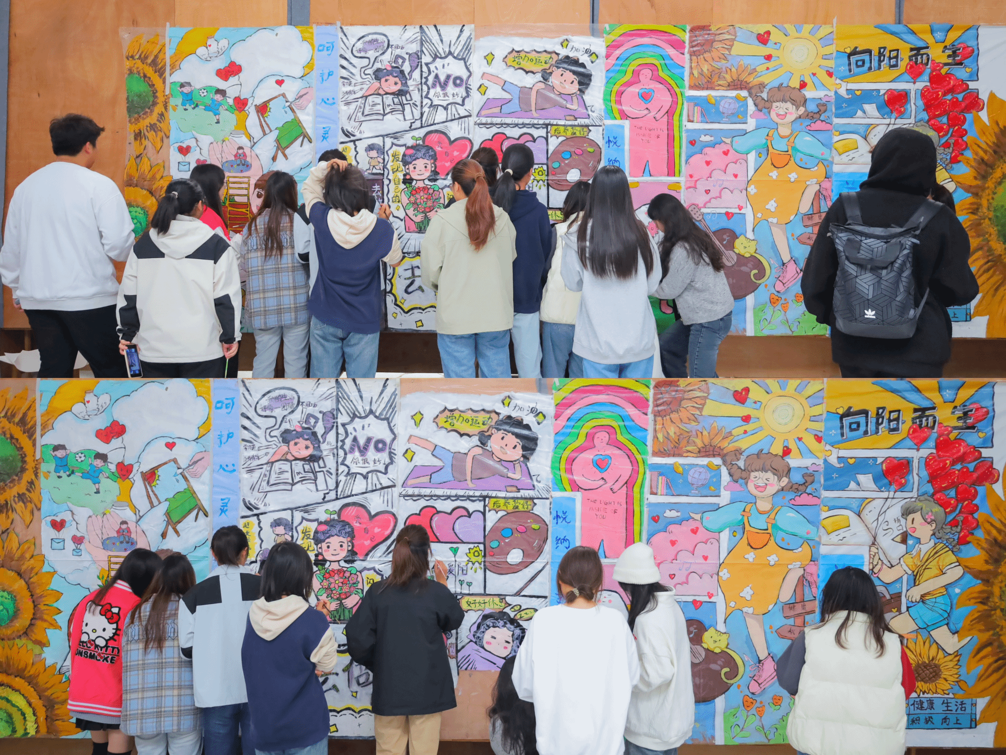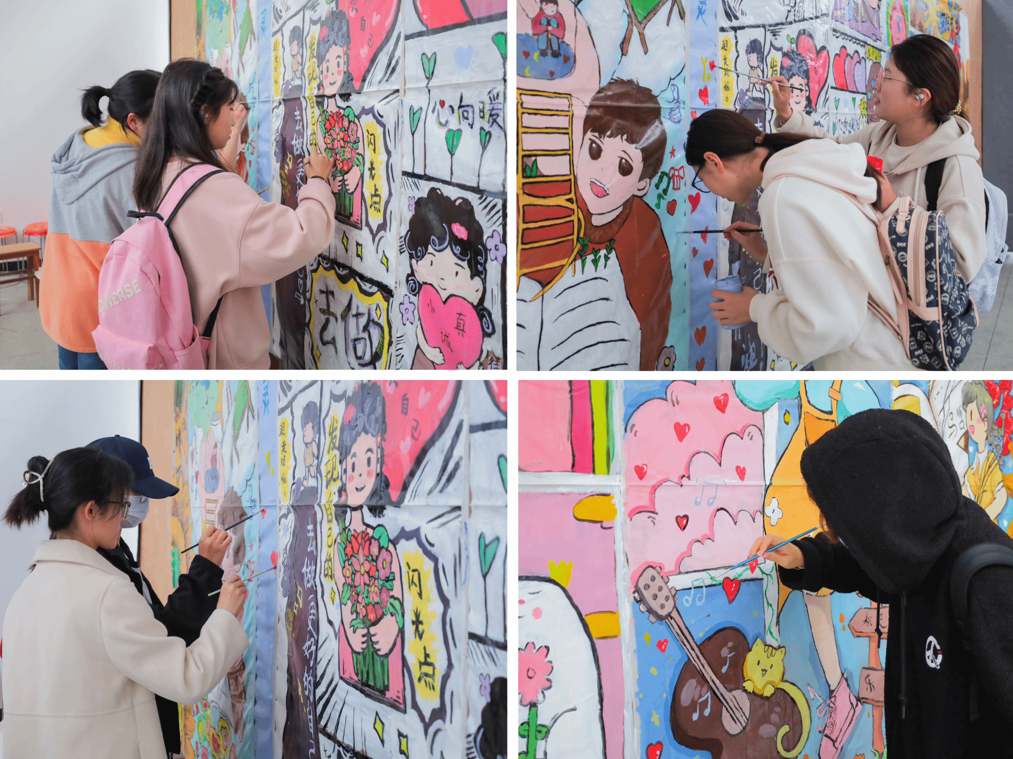 随着时间的推移,一幅幅生动的作品跃然“墙”上。阳光普照大地、双手托举梦想、鲜花寄托期望……空白展板记录了每一位学生的心绪,承载了“呵护心灵”的美好祝愿。来往学生纷纷为这块色彩斑斓的展板驻足,留下自己与墙绘的“打卡照”。