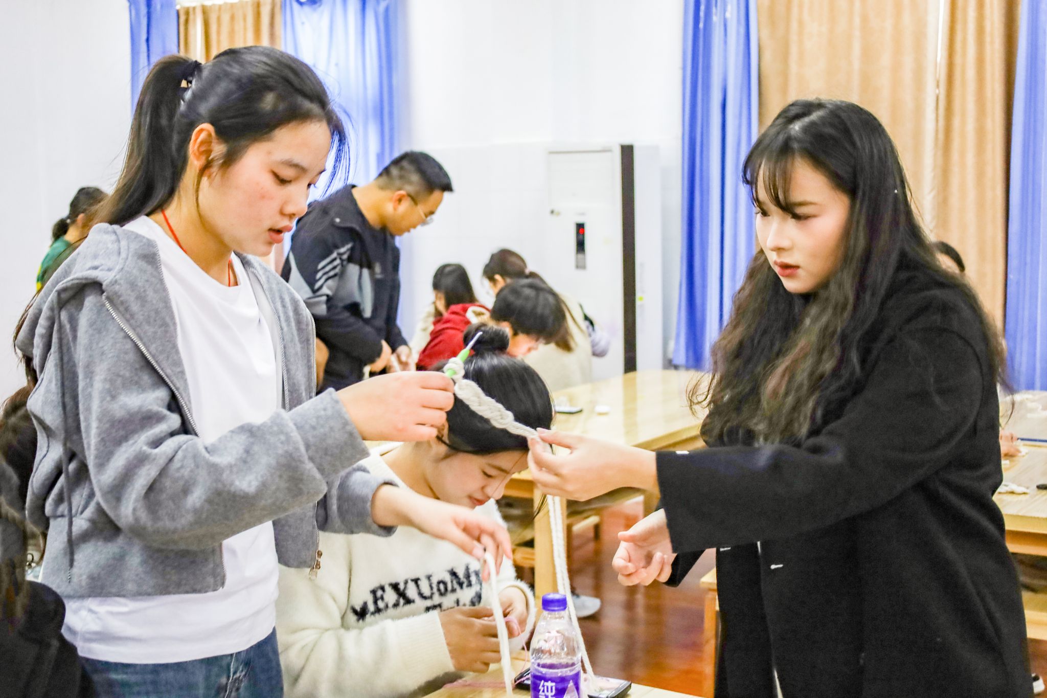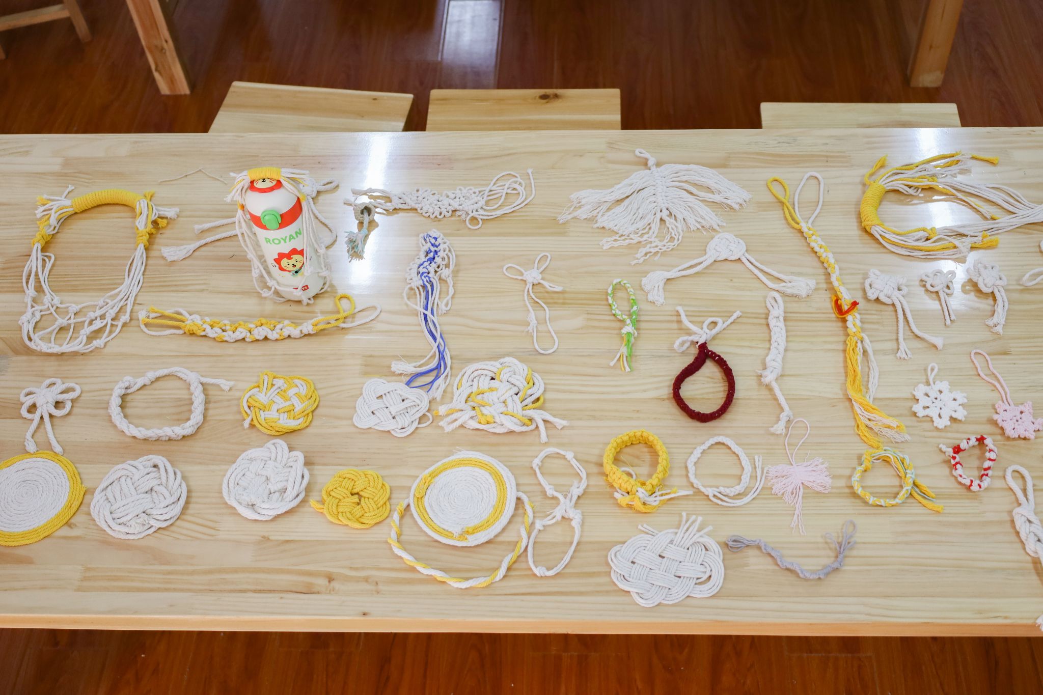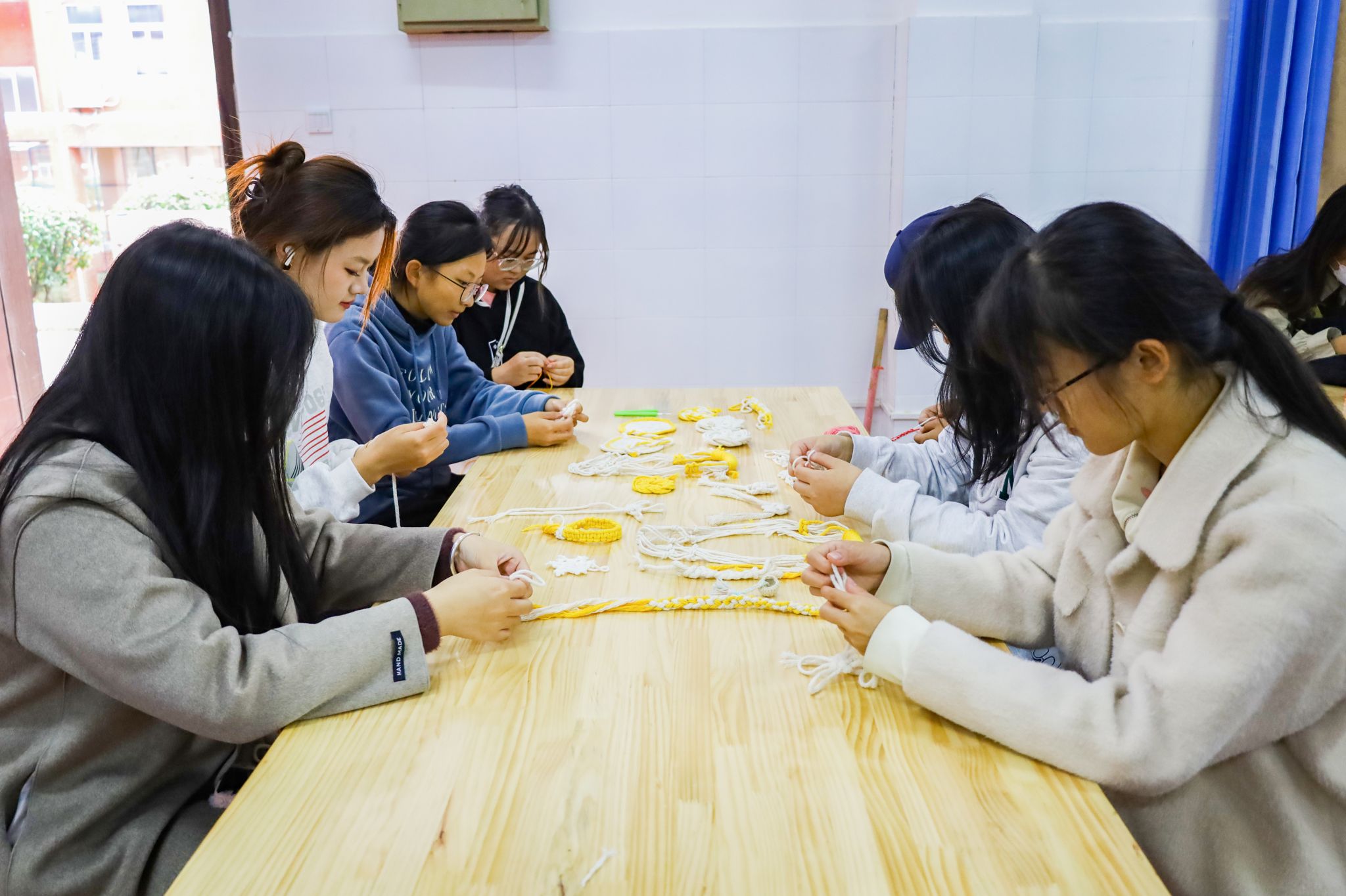 学生们操作着不同尺寸的钩针,使用粗细不一、颜色各异的线团,穿插以锁扣、结环、编织等多样的编织手法制作出了手链、戒指、挂饰、杯垫等50余件手工作品。