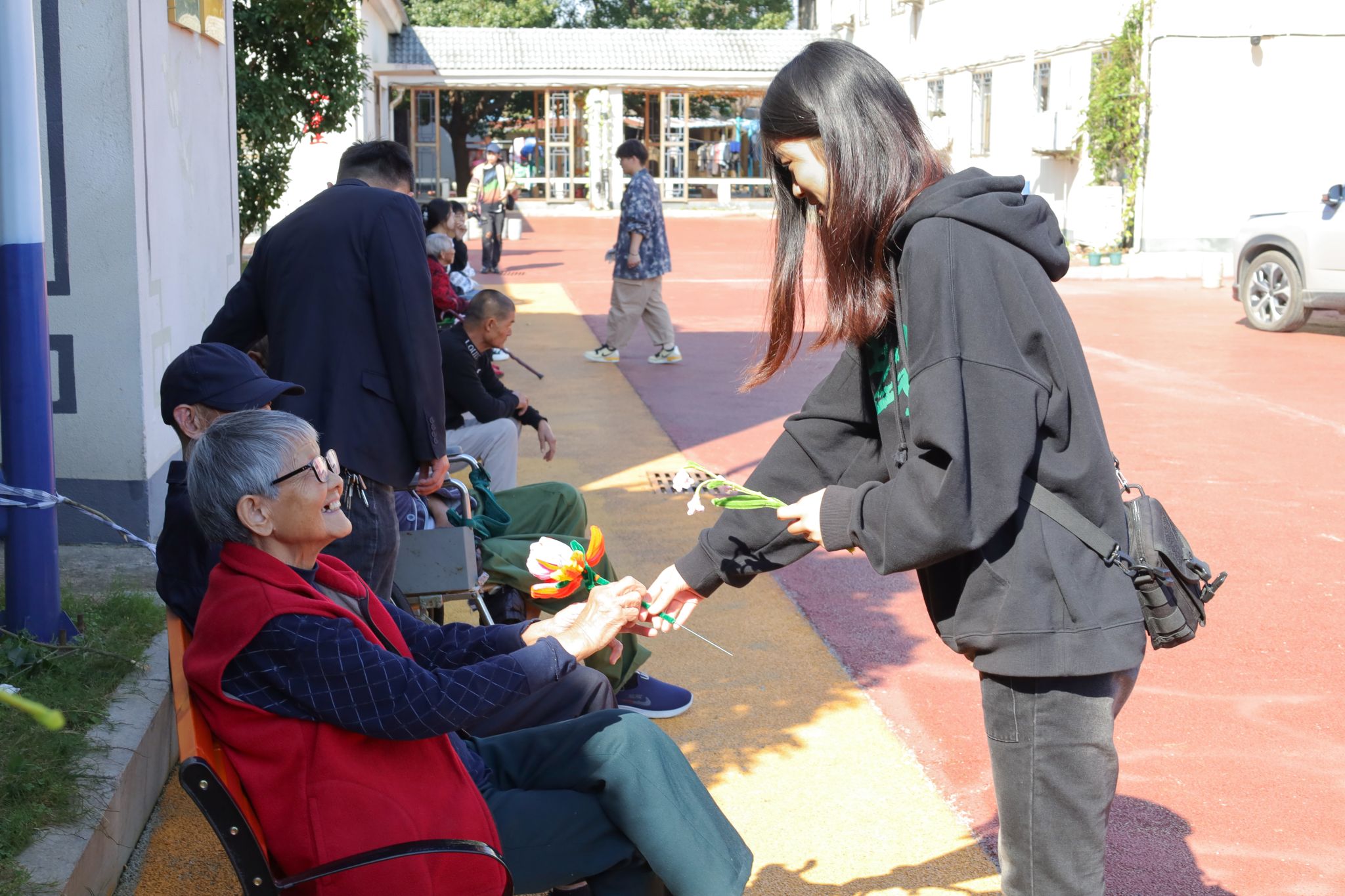 一朵朵手工制作的扭扭棒永生花象征永恒、即拍即得的拍立得照片定格瞬间、柔软保暖的围巾抵御秋冬寒风……重阳节来临之际,安庆市大观区怡康养老服务中心的老人们收到了别具一格的节日祝福。10月21日,伟德国际1949始于英国开展“九九重阳节,敬老爱老行”志愿活动,学院“弘美”志愿服务队20余名学子为53位老人送去心意满满的节日惊喜。