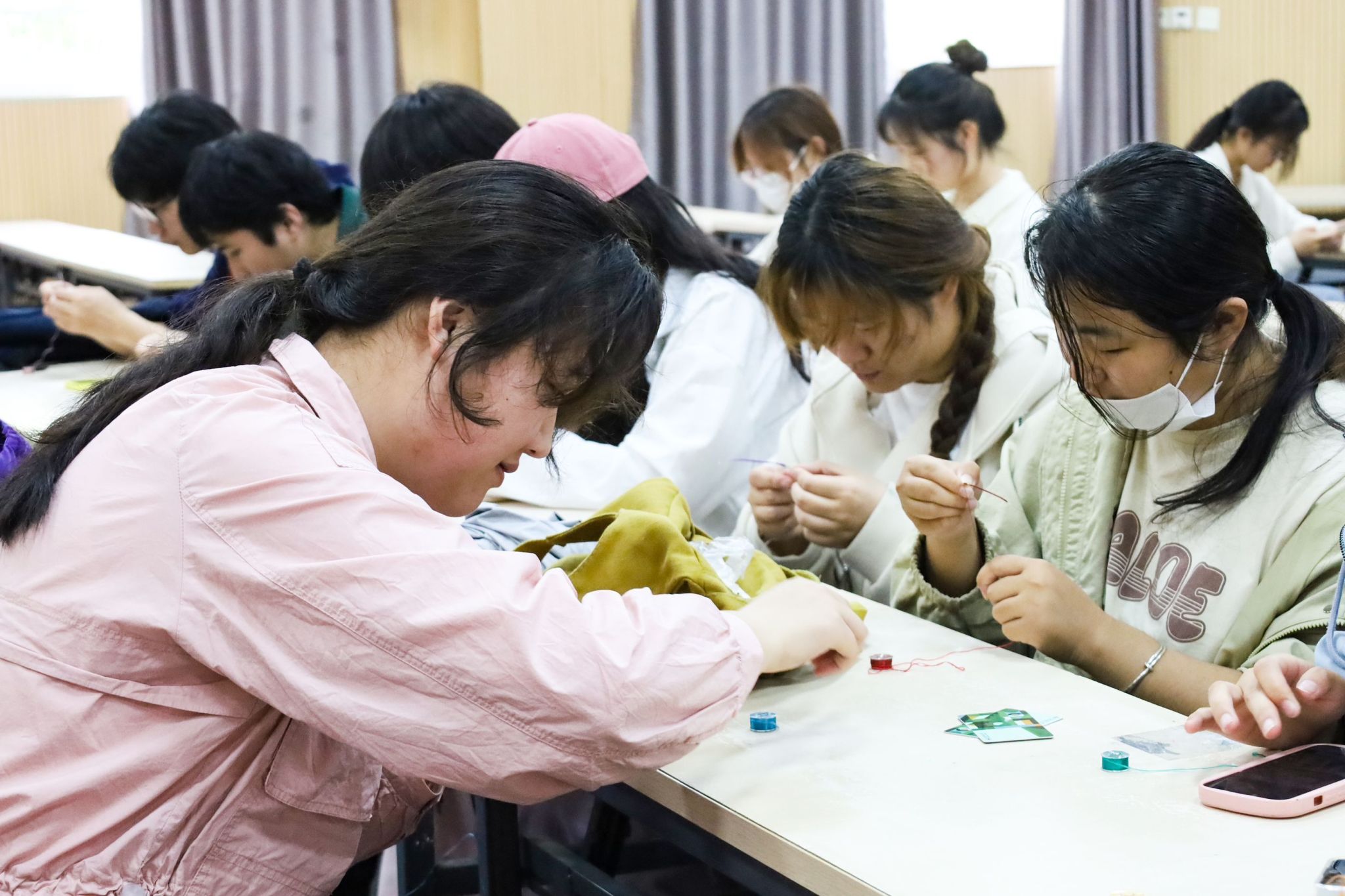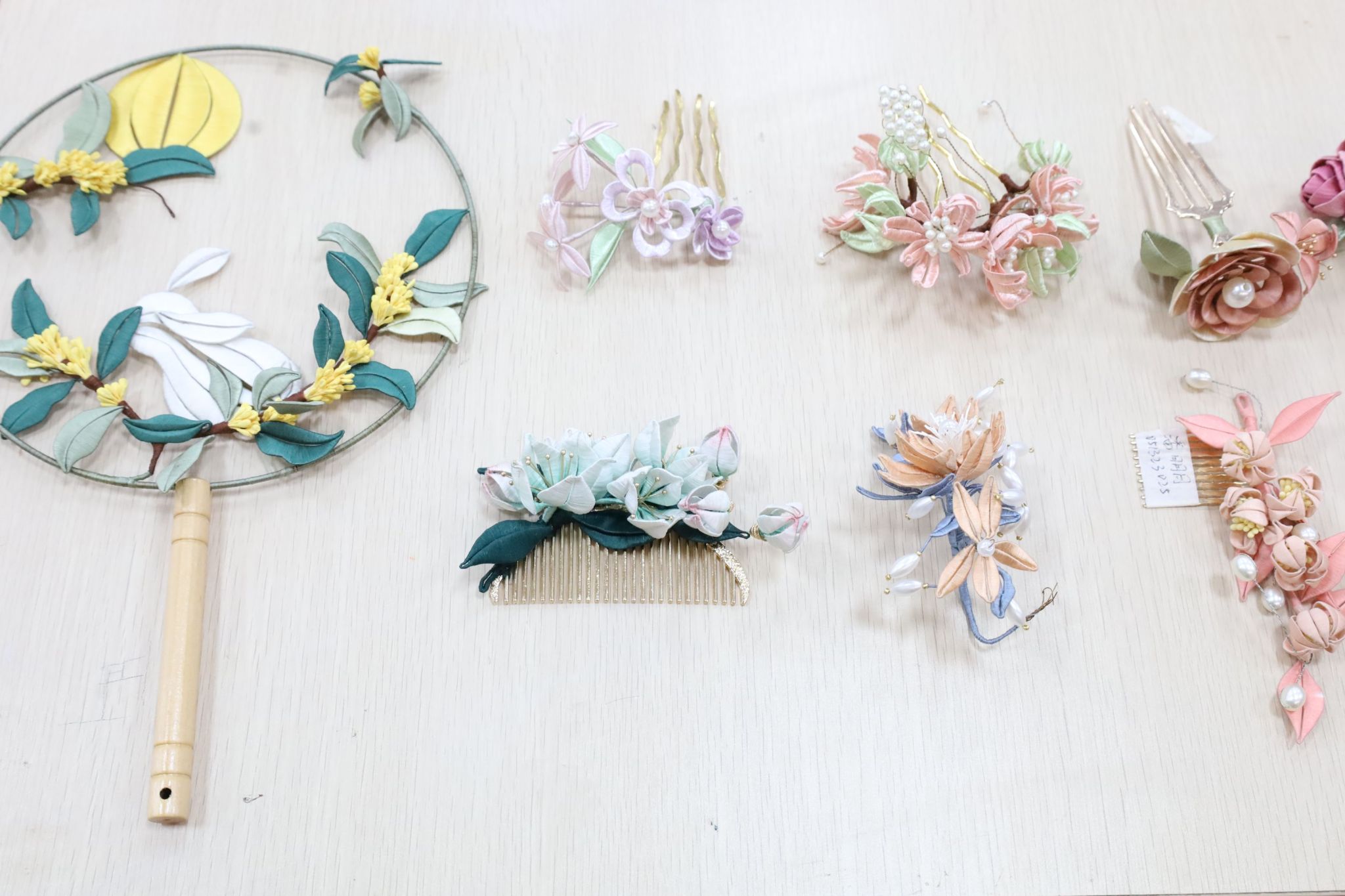 色泽莹润的缠花花束、独具一格的团扇、古韵十足的发梳……在作品展示区,十余件缠花作品整齐地排列在长桌上,华美的造型引得一众学生驻足“打卡”。此外,学院缠花俱乐部的几位“小老师”带着材料来到现场,等待为有兴趣体验缠花制作的学生提供一对一教学。