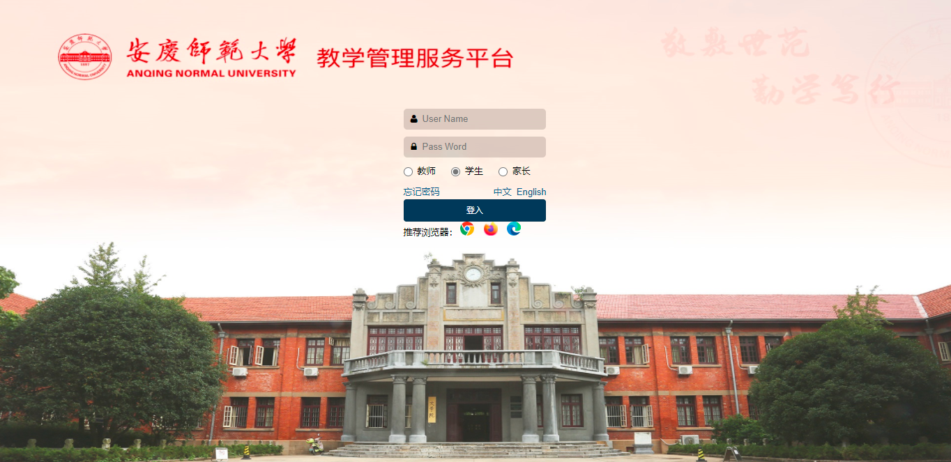 一、学生登录校园网主页,点击“教务管理”登录教学管理服务平台http://jwxt.aqnu.edu.cn ,选择学生端,输入用户名与密码登录系统。